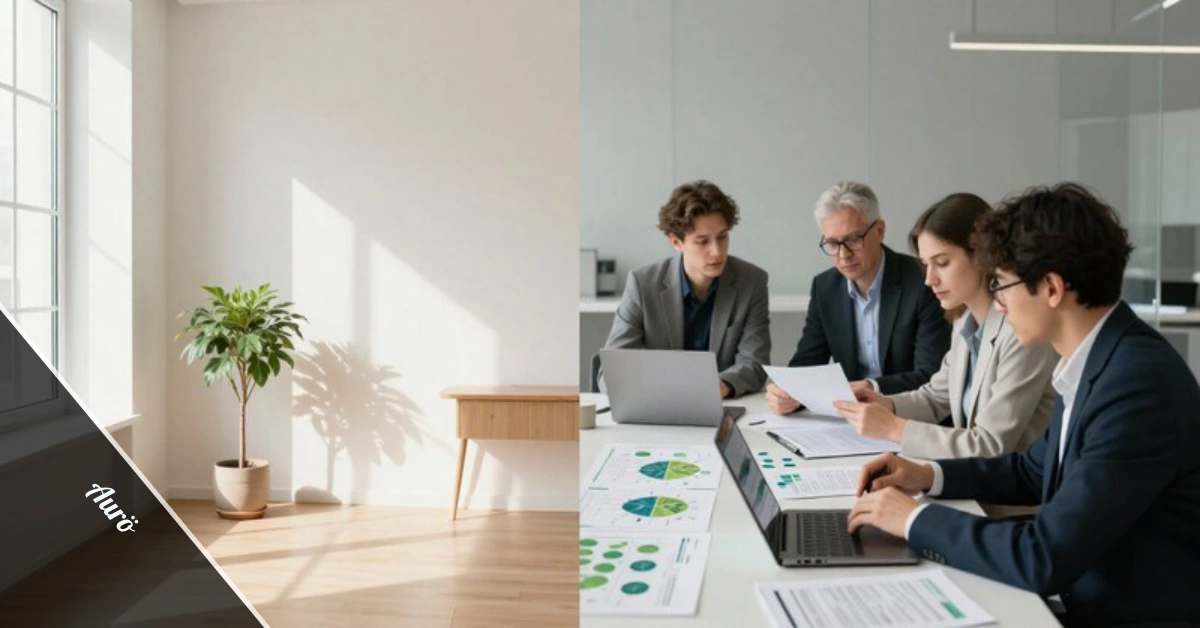 Split image showing Aurö dual meaning with minimalist Nordic wellness interior and academic environmental economics research workshop
